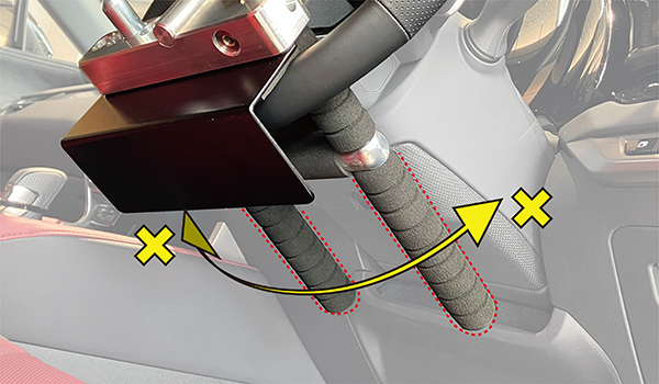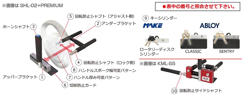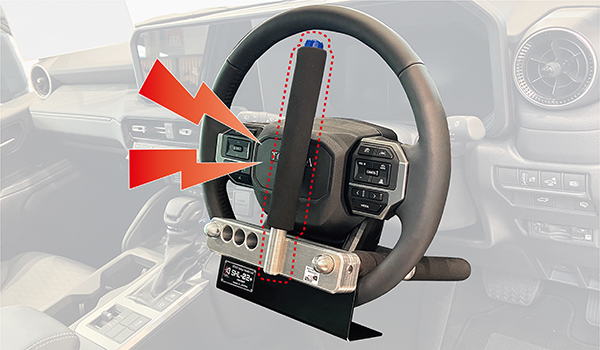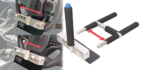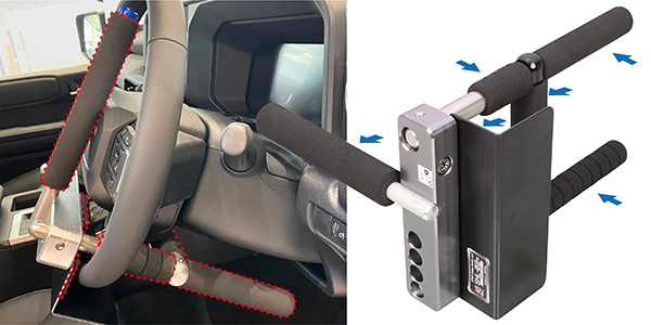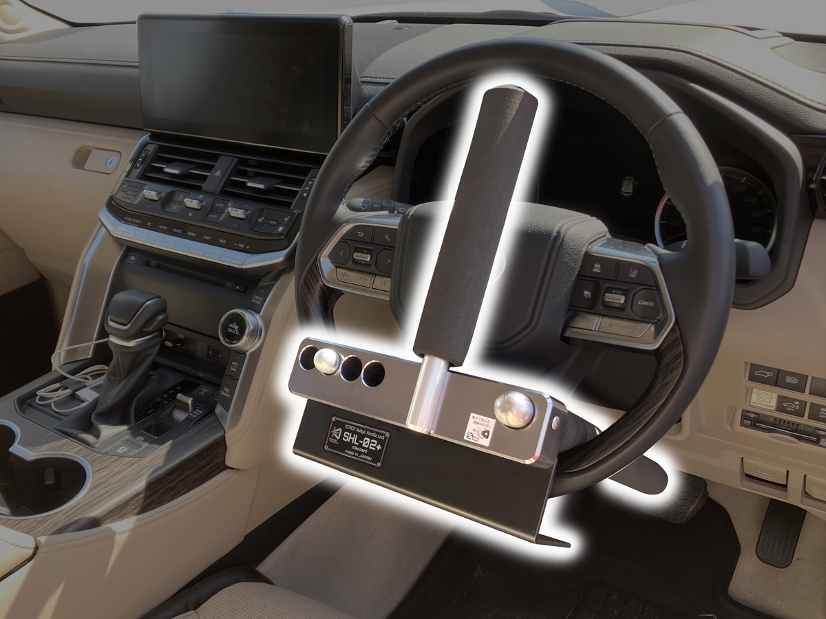 軽自動車から乗用車、高級車、ワンボックス等車種を選ばない! ハンドルのスポーク部分に装着する強固でハンドル破壊防止プレートを備えたハンドル用の回り止めロックです。さらなる使い勝手と強固さ、破壊されにくさを考慮した設計です。 FOR ANY TYPE OF VEHICLE, INCLUDING MINI VEHICLES, PASSENGER CARS, LUXURY CARS, AND ONE-BOX CARS! A NON-ROTATING LOCK FOR STEERING WHEELS WITH A STRONG, ANTI-SMASHING PLATE ATTACHED TO THE SPOKES OF THE STEERING WHEEL. DESIGNED WITH CONSIDERATION FOR FURTHER USABILITY, ROBUSTNESS, AND RESISTANCE TO DESTRUCTION.