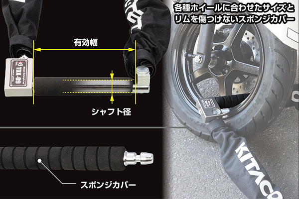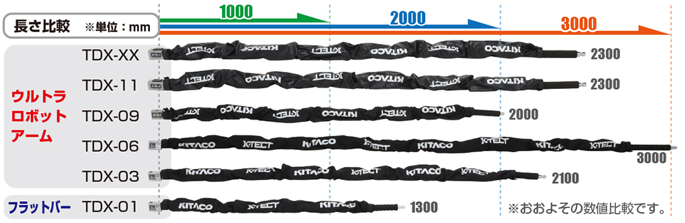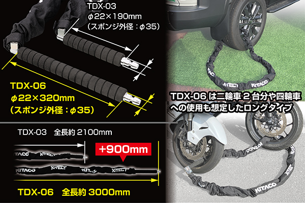 TDX-03(アーム角・シャフト径)をベースにしたロングタイプ。オートバイ2台の同時ロックや四輪車のホイールロックにも対応します。