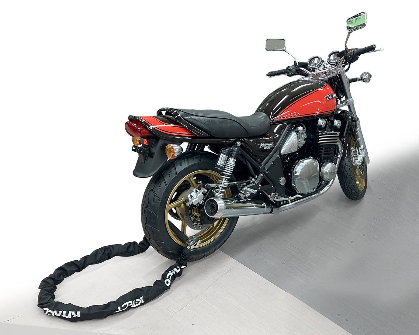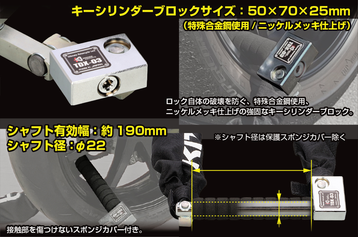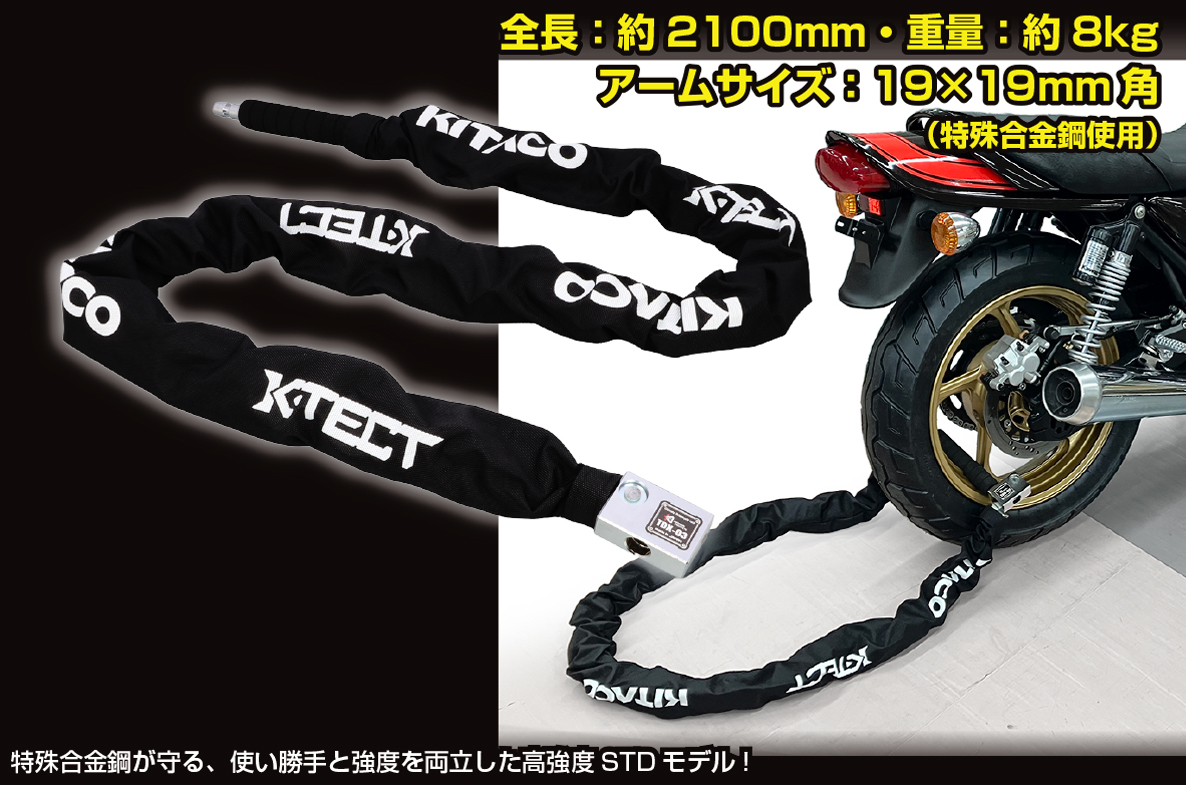 キタコ独自のロボットアームジョイント構造を継承し、高強度特殊合金鋼とスチールリベットでアーム部とロックシャフト部を強固に締結。物理的な破壊を寄せ付けない耐攻撃性を実現するとともに、細部までこだわったプレミアム設計により、耐久性と美しさを兼ね備え、大切な愛車を長く安全に護ります。